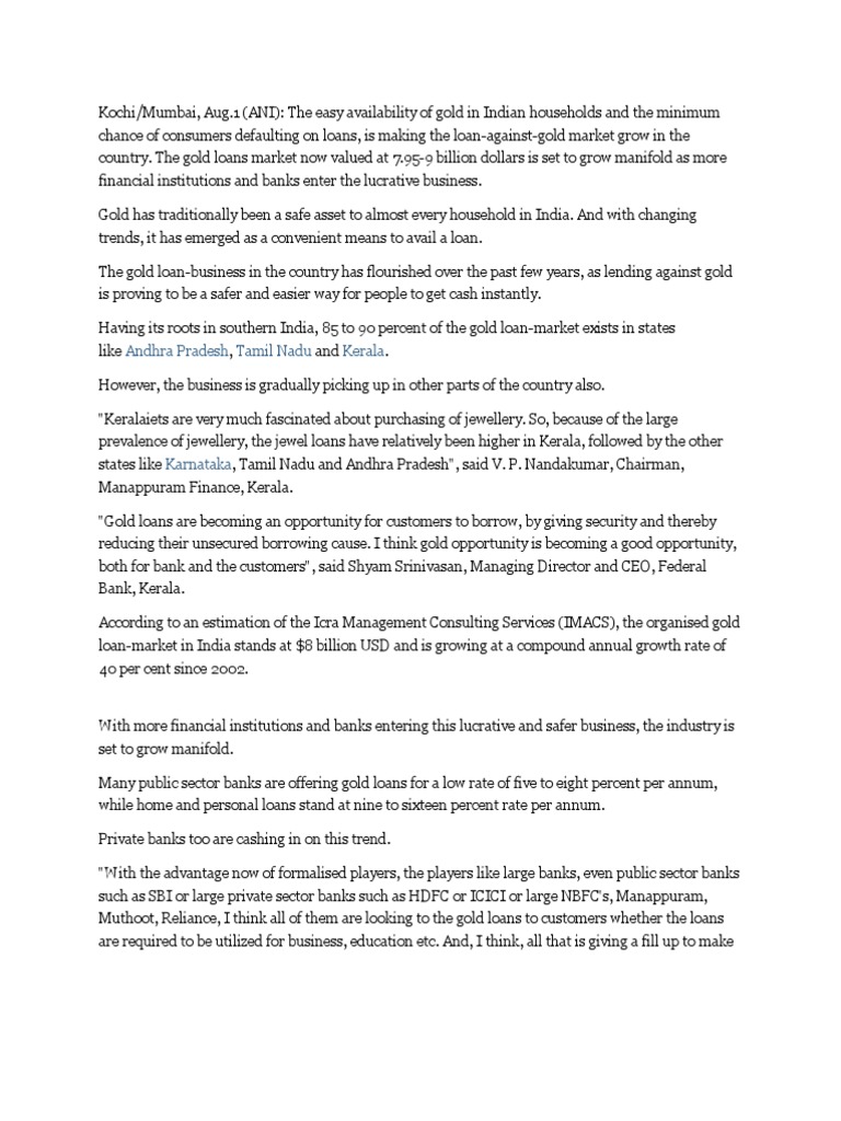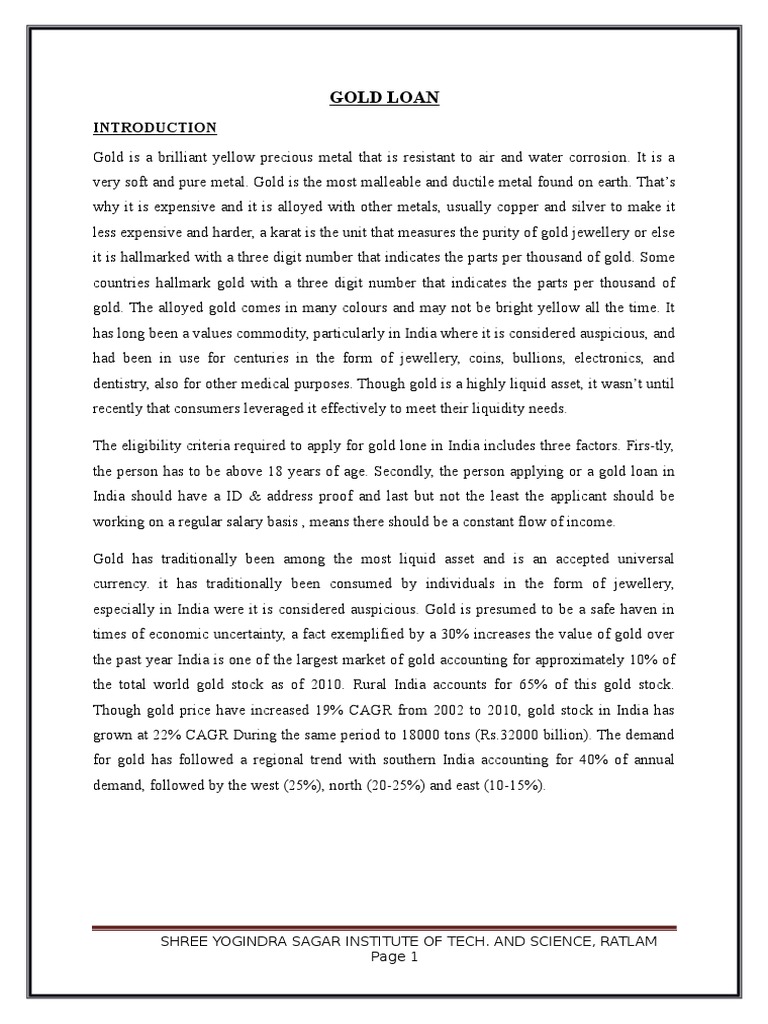 Gold loan or loan against gold is a secured loan in which a customer pledges hisher gold ornaments as collateral with a gold loan company.