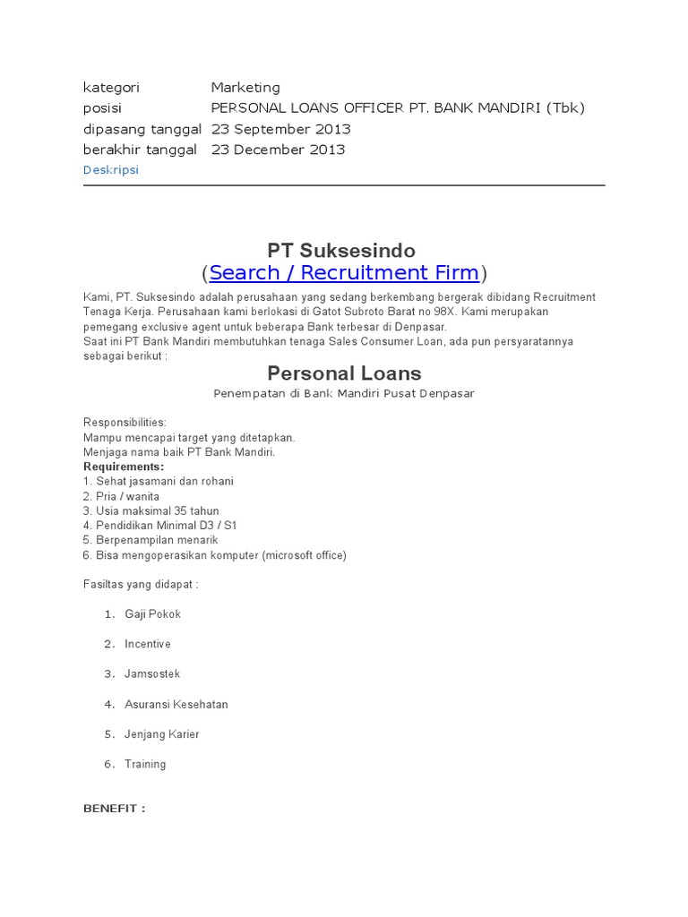 Lowongan Kerja Card Loan Officer Card Loan Foficer Ttraining